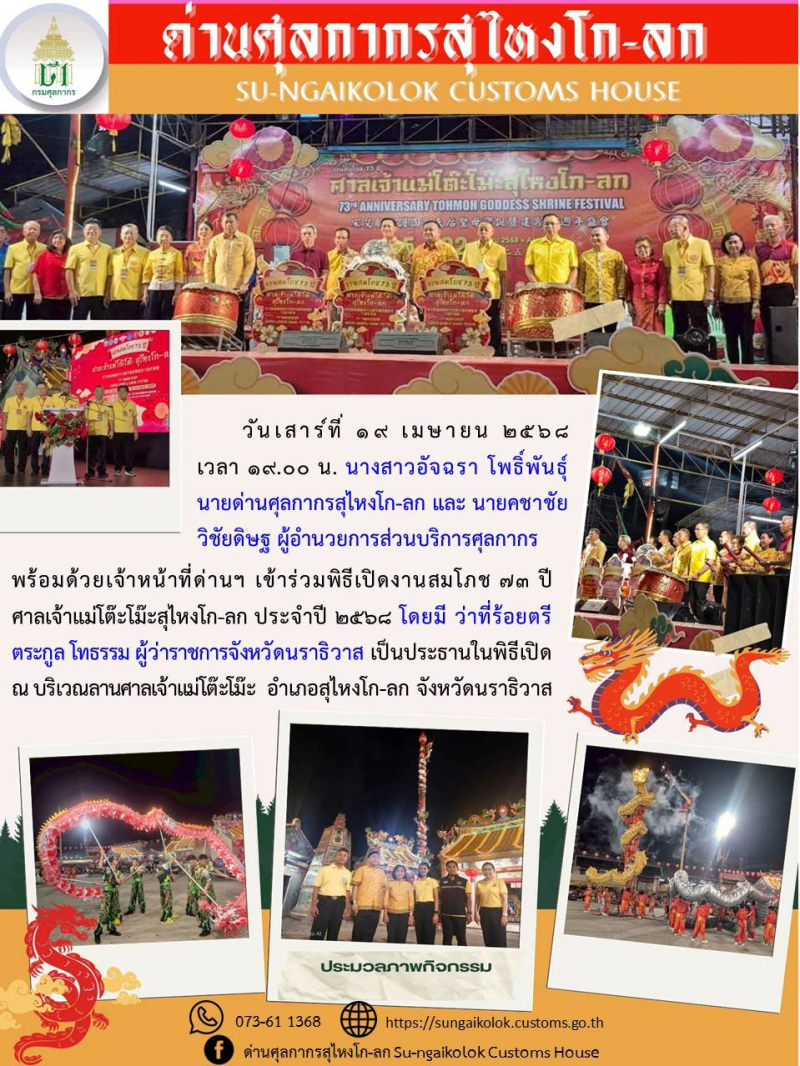 *** ด่านศุลกากรสุไหงโก-ลก เข้าร่วมพิธีเปิดงานสมโภช 73 ปี ศาลเจ้าแม่โต๊ะโม๊ะสุไหงโก-ลก ประจำปี 2568 ***