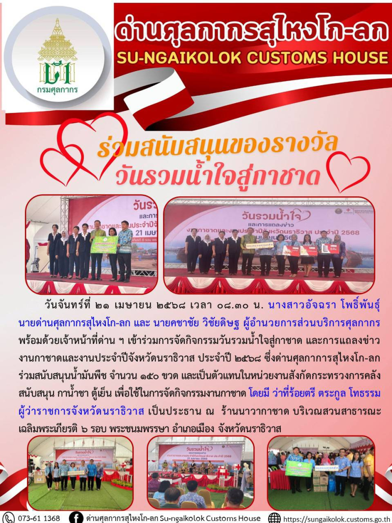 *** ด่านศุลกากรสุไหงโก-ลก เข้าร่วมการจัดกิจกรรมวันรวมน้ำใจสู่กาชาด และการแถลงข่าวงานกาชาดและงานประจำปีจังหวัดนราธิวาส ประจำปี 2568 ***