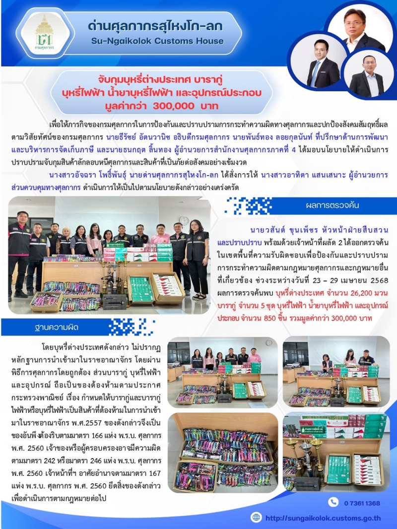 ** ด่านศุลกากรสุไหงโก-ลก จับกุมบุหรี่ต่างประเทศ บารากู่ บุหรี่ไฟฟ้า น้ำยาบุหรี่ไฟฟ้า และอุปกรณ์ประกอบ มูลค่ากว่า 300,000 บาท **