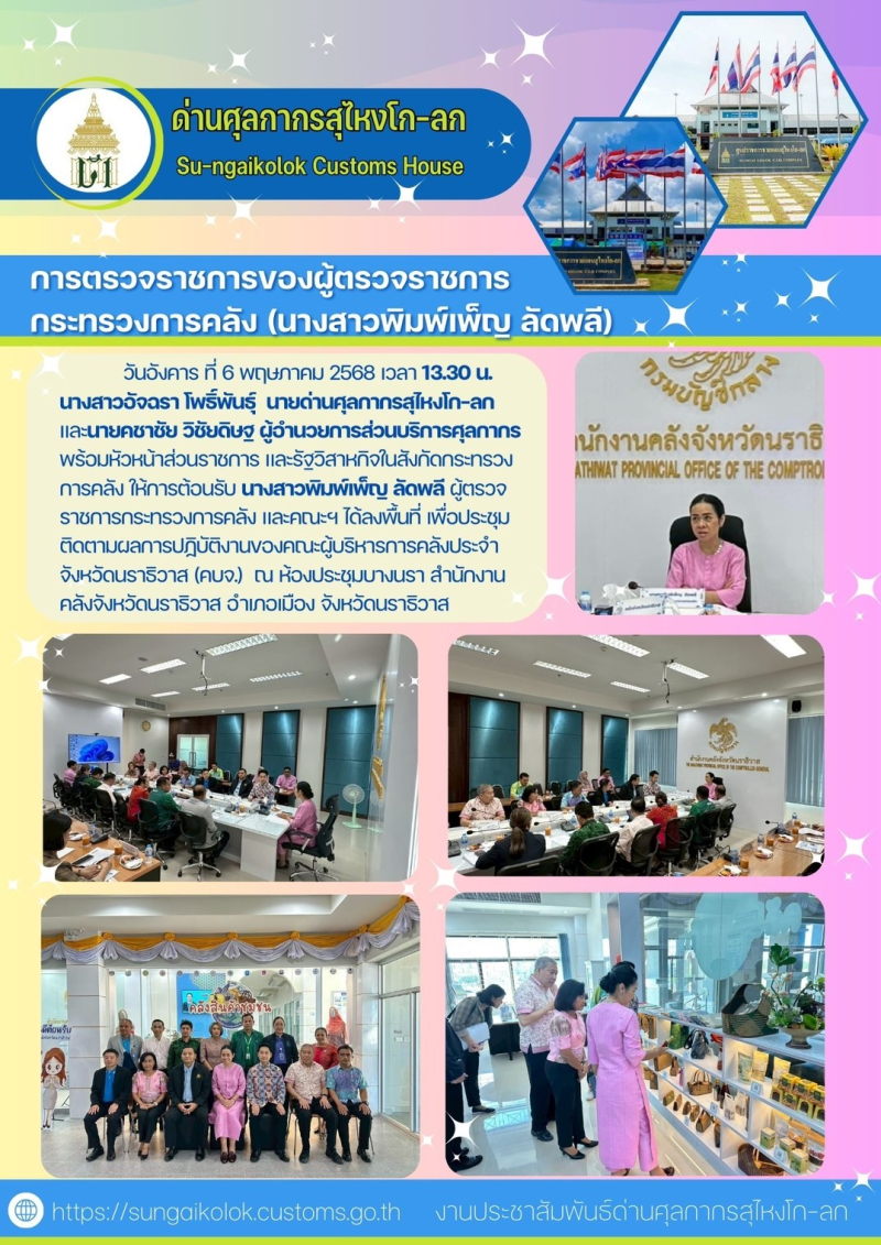 ** ด่านศุลกากรสุไหงโก-ลก เข้าร่วมประชุมการตรวจราชการของผู้ตรวจราชการ กระทรวงการคลัง (นางสาวพิมพ์เพ๋็ญ ลัดพลี) **
