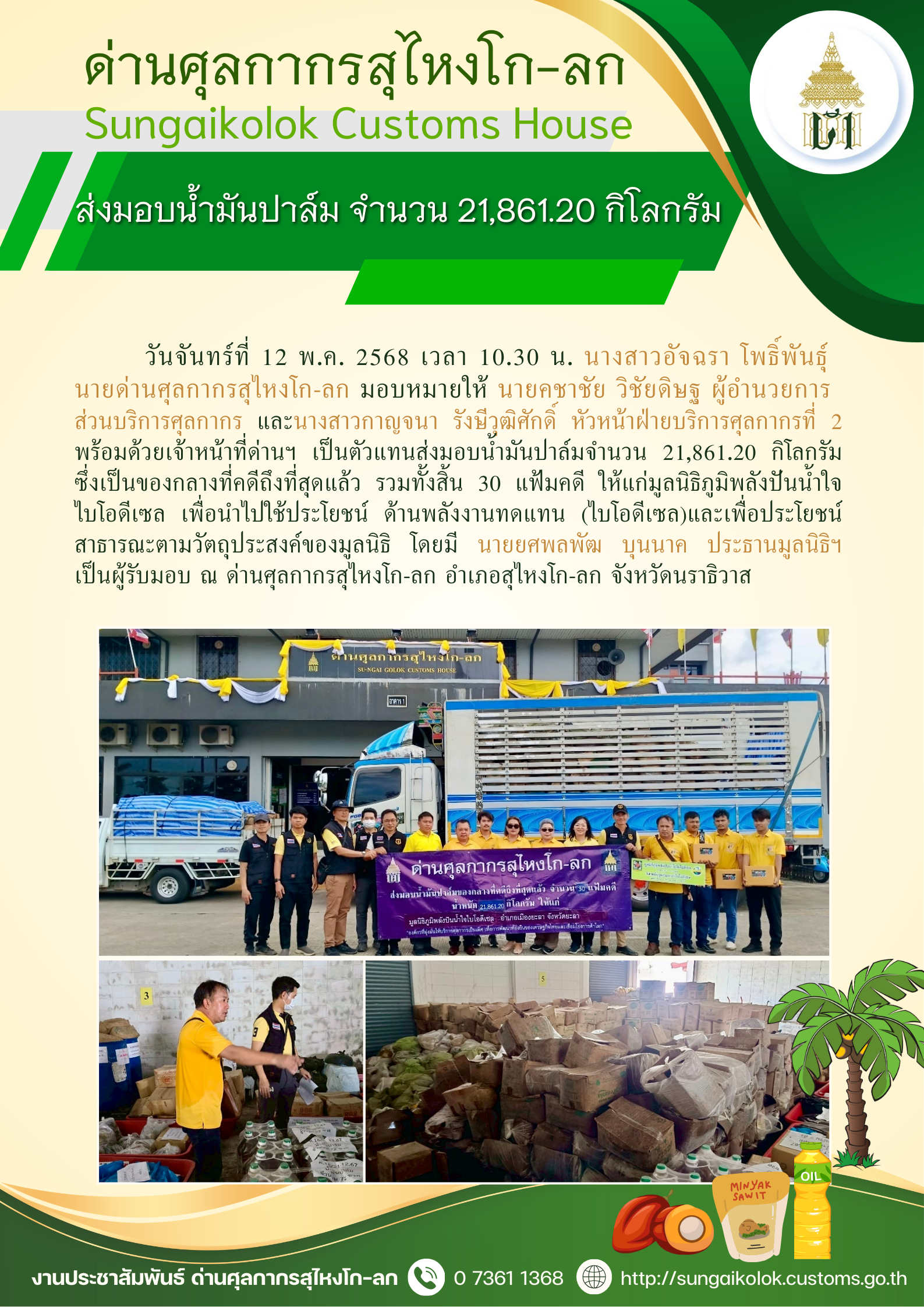 *** ด่านศุลกากรสุไหงโก-ลก ส่งมอบน้ำมันปาล์ม จำนวน 21,861.20 กิโลกรัม ***
