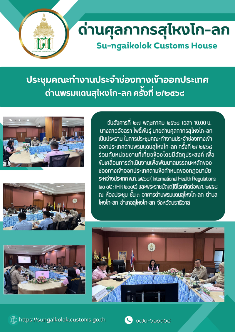 ** ด่านศุลกากรสุไหงโก-ลก ประชุมคณะทำงานประจำช่องทางเข้า-ออกประเทศ ครั้งที่ 2/2568 **