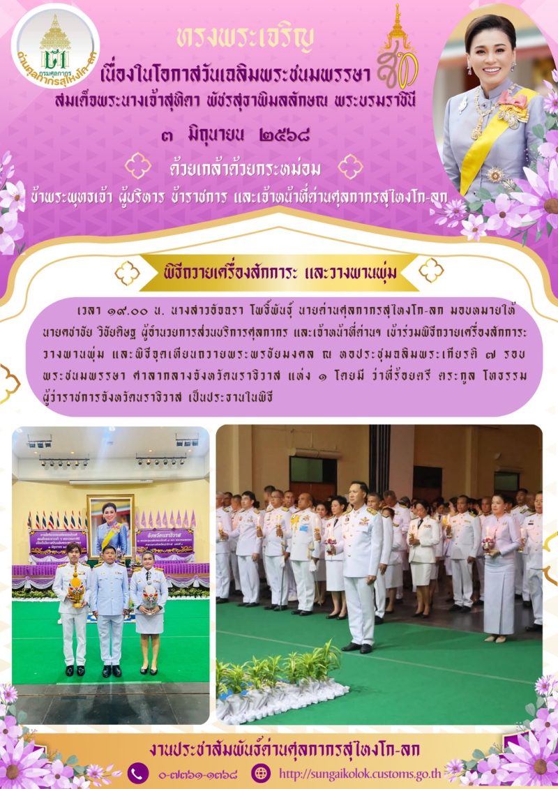 ด่านศุลกากรสุไหงโก-ลก ร่วมพิธีถวายเครื่องสักการะ และวางพานพุ่ม เนื่องในโอกาสวันเฉลิมพระชนมพรรษา สมเด็จพระนางเจ้าสุทิดา พัชรสุธาพิมลลักษณ พระบรมราชินี