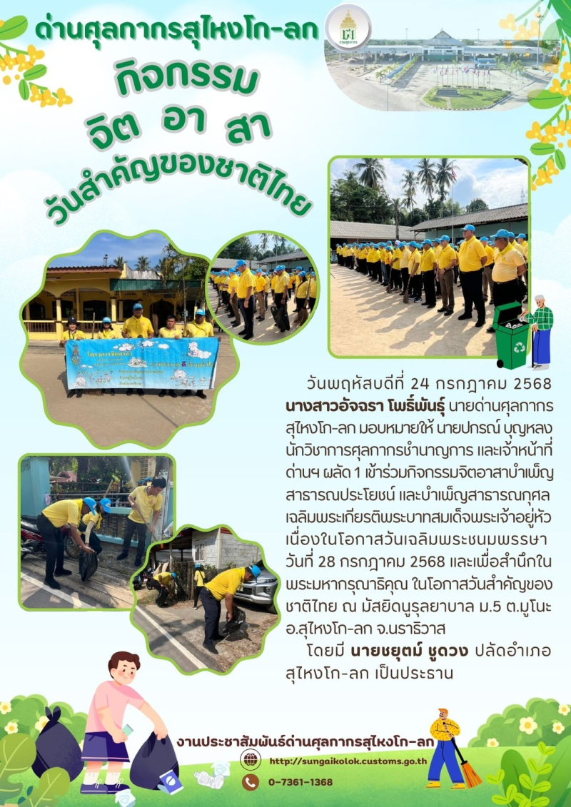 *** ด่านศุลกากรสุไหงโก-ลก เข้าร่วมกิจกรรมจิตอาสาบำเพ็ญสาธารณประโยชน์ และบำเพ็ญสาธารณกุศล เฉลิมพระเกียรติพระบาทสมเด็จพระเจ้าอยู่หัว เนื่องในโอกาสวันเฉลิมพระชนมพรรษา วันที่ 28 กรกฎาคม 2568 ***