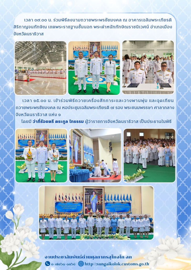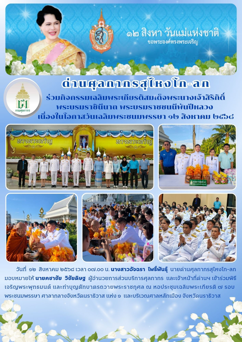 **ด่านศุลกากรสุไหงโก-ลก ร่วมกิจกรรมเฉลิมพระเกียรติสมเด็จพระนางเจ้าสิริกิติ์ พระบรมราชินีนาถ พระบรมราชชนนีพันปีหลวง เนื่องในโอกาสวันเฉลิมพระชนมพรรษา ๑๒ สิงหาคม ๒๕๖๘**