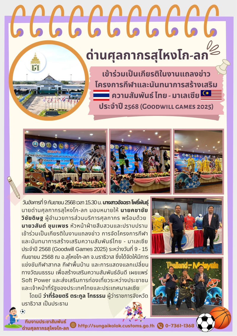 ด่านศุลกากรสุไหงโก-ลก เข้าร่วมเป็นเกียรติในงานแถลงข่าวโครงการกีฬาและนันทนาการสร้างเสริมความสัมพันธ์ ไทย - มาเลเซีย ประจำปี 2568 (Goodwill games 2025)