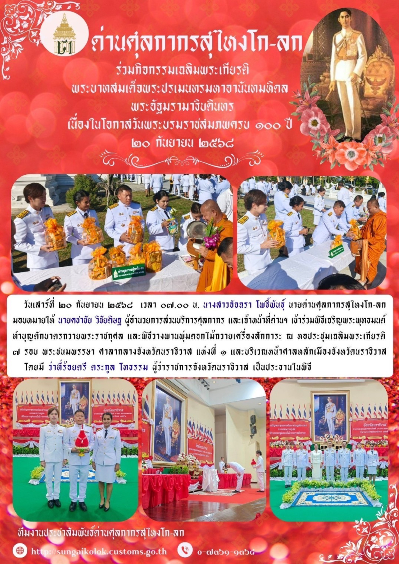 *** ด่านศุลกากรสุไหงโก-ลก ร่วมกิจกรรมเฉลิมพระเกียรติ พระบาทสมเด็จพระปรเมนทรมหาอานันทมหิดล พระอัฐมรามาธิบดินทร เนื่องในโอกาสวันพระบรมราชสมภพครบ 100 ปี 20 กันยายน 2568 ***
