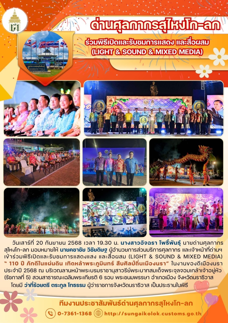 ***ด่านศุลกากรสุไหงโก-ลก เข้าร่วมพิธีเปิดและรับชมการแสดงและสื่อผสม (LIGHT & SOUND & MIXED MEDIA) " 110 ปี ภักดีในแผ่นดิน เทิดหล้าพระภูมินทร์ สืบศิลป์ถิ่นเมืองนรา "