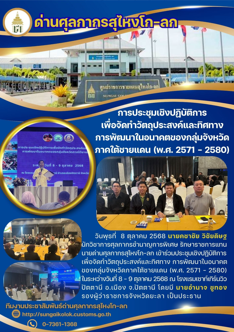ด่านศุลกากรสุไหงโก-ลก เข้าร่วมประชุมเชิงปฏิบัติการเพื่อจัดทำวัตถุประสงค์และทิศทางการพัฒนาในอนาคตของกลุ่มจังหวัดภาคใต้ชายแดน (พ.ศ. 2571 - 2580)