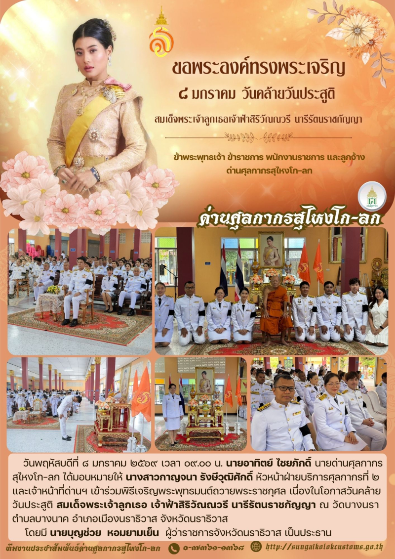 ***ด่านศุลกากรสุไหงโก-ลก เข้าร่วมพิธีเจริญพระพุทธมนต์ถวายพระราชกุศล เนื่องในโอกาสวันคล้ายวันประสูติ สมเด็จพระเจ้าลูกเธอ เจ้าฟ้าสิริวัณณวรี นารีรัตนราชกัญญา***