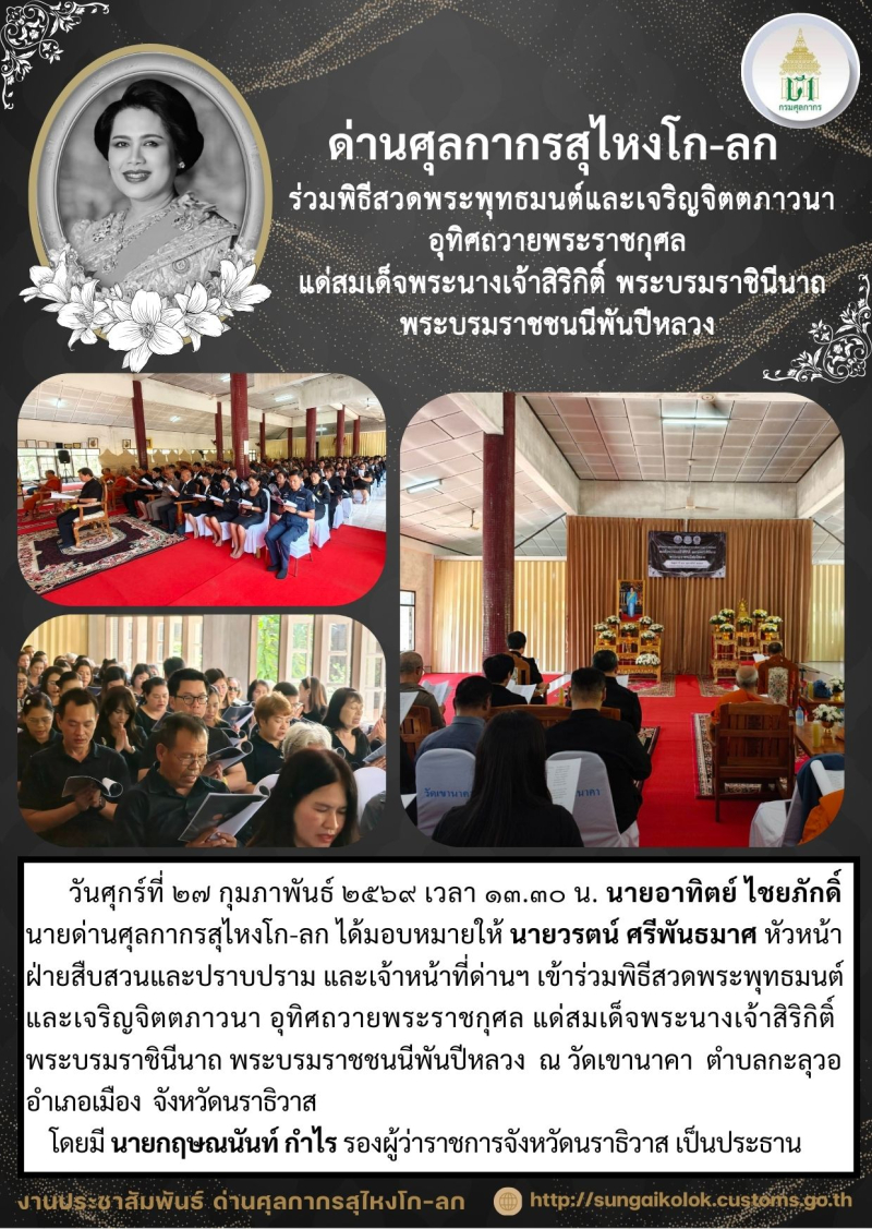 ***ด่านศุลกากรสุไหงโก-ลก ร่วมพิธีสวดพระพุทธมนต์และเจริญจิตตภาวนาอุทิศถวายพระราชกุศล แด่สมเด็จพระนางเจ้าสิริกิติ์ พระบรมราชินีนาถ พระบรมราชชนนีพันปีหลวง***
