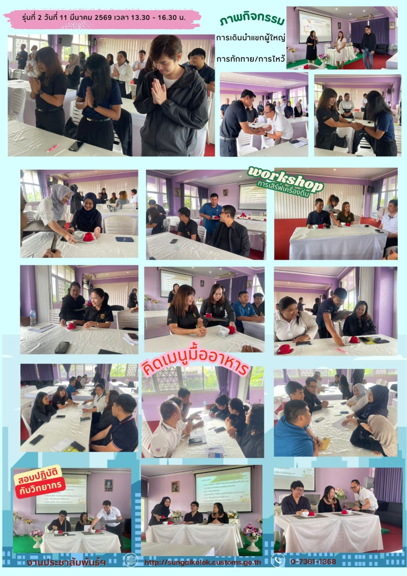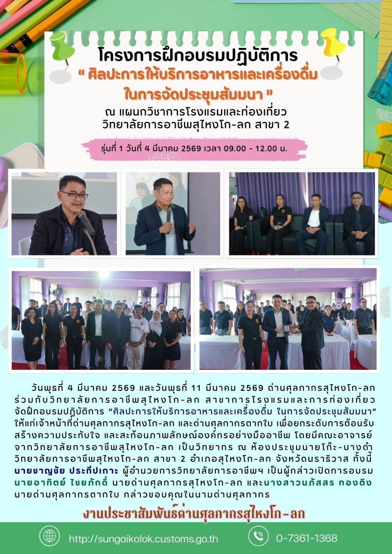 ด่านศุลกากรสุไหงโก-ลก ร่วมกับวิทยาลัยการอาชีพสุไหงโก-ลก สาขาการโรงแรมและการท่องเที่ยว จัดฝึกอบรมปฏิบัติการ "ศิลปะการให้บริการอาหารและเครื่องดื่ม ในการจัดประชุมสัมมนา"
